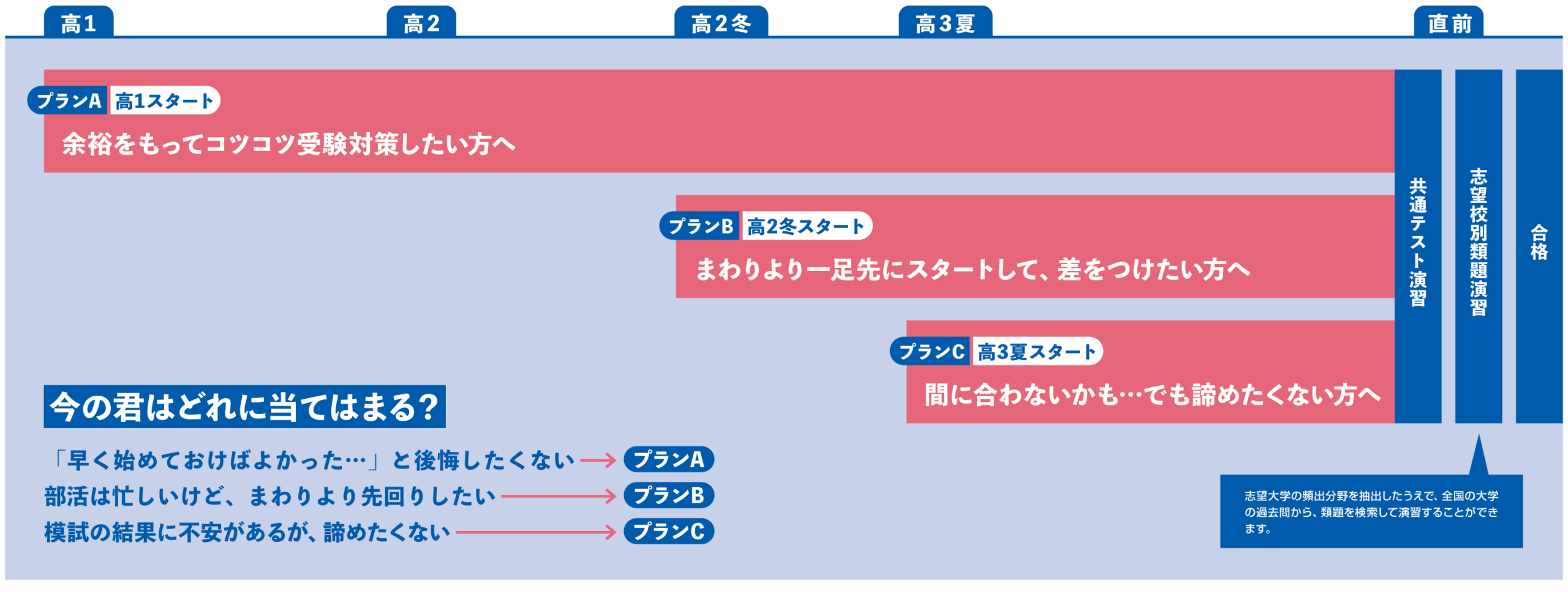 志望校(目標地点)と今のあなた(現在地点)から、最適なプランをご提案します。